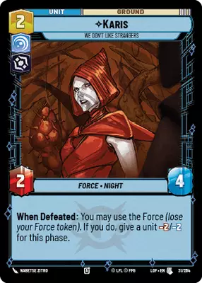 When Defeated: You may use the Force (lose your Force token). If you do, give a unit –2/–2 for this phase.