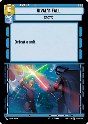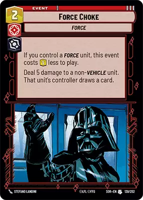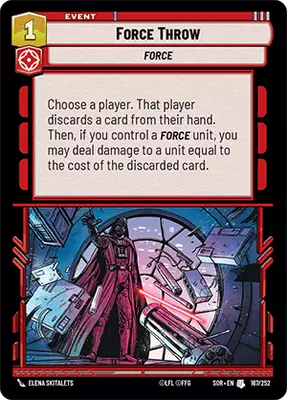 Choose a player. That player discards a card from their hand. Then, if you control a FORCE unit, you may deal damage to a unit equal to the cost of the discarded card.