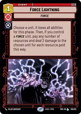 Choose a unit. It loses all abilities for this phase. Then, if you control a FORCE unit, pay any number of resources and deal 2 damage to the chosen unit for each resource paid this way.