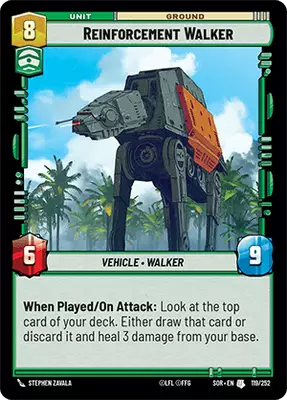When Played/On Attack: Look at the top card of your deck. Either draw that card or discard it and heal 3 damage from your base.