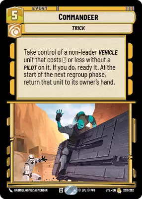 Take control of a non-leader Vehicle unit that costs 6 or less without a Pilot on it. If you do, ready it. At the start of the next regroup phase, return that unit to its owner's hand.