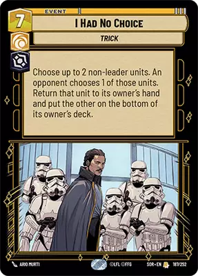 Choose up to 2 non-leader units. An opponent chooses 1 of those units. Return that unit to its owner’s hand and put the other on the bottom of its owner’s deck.